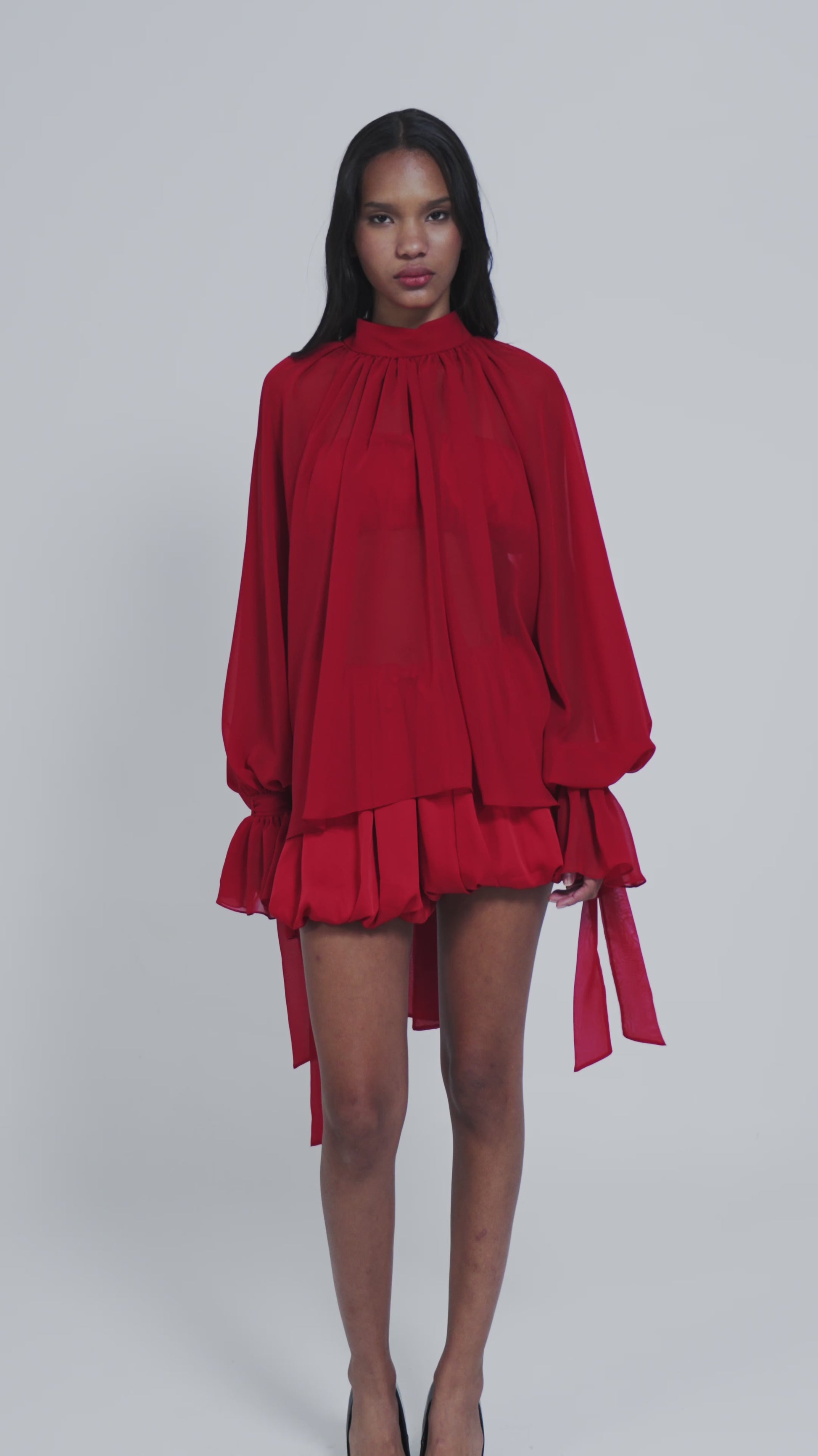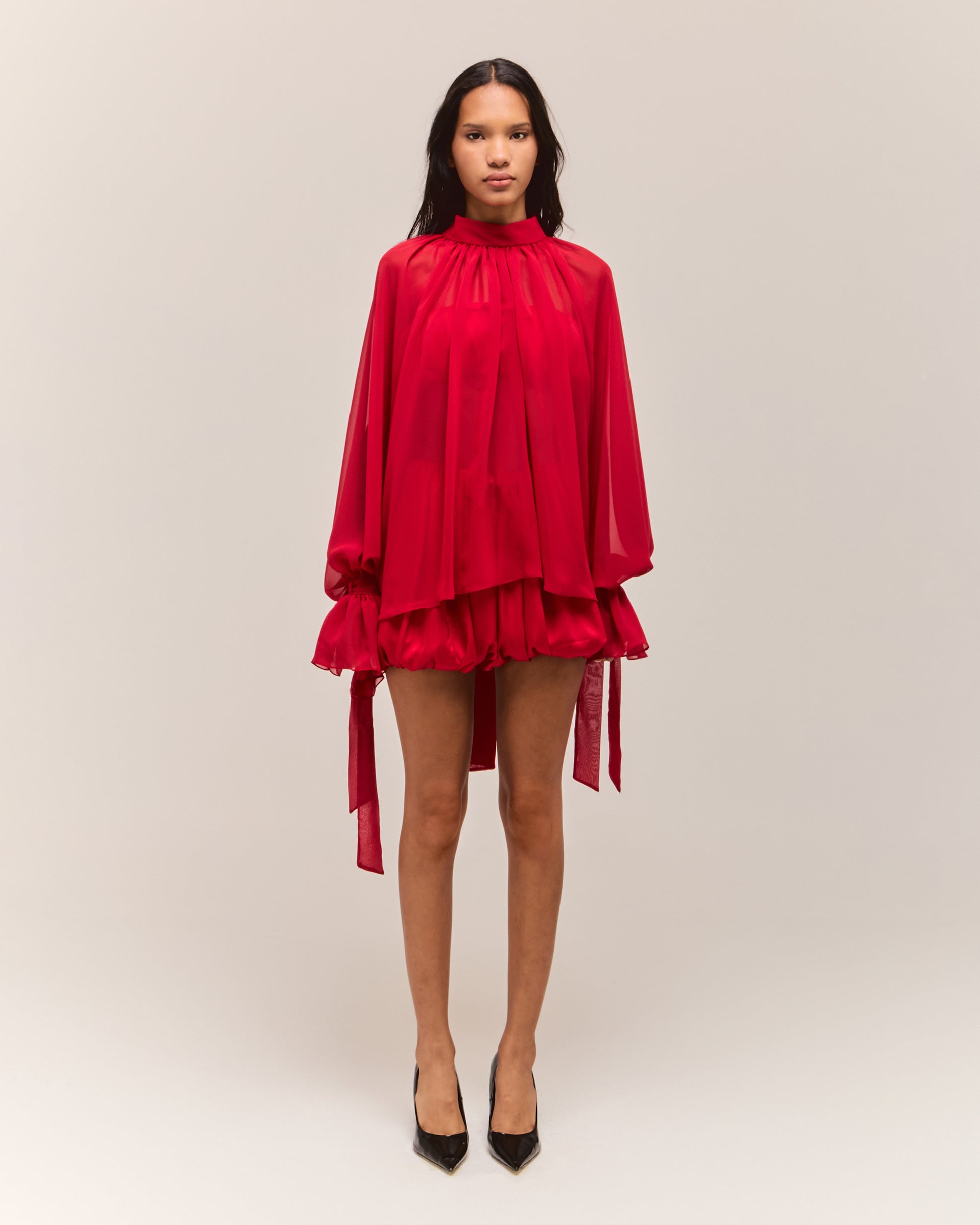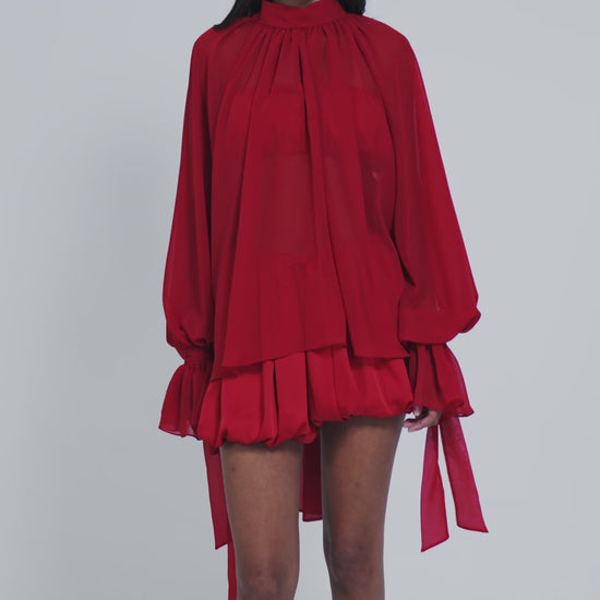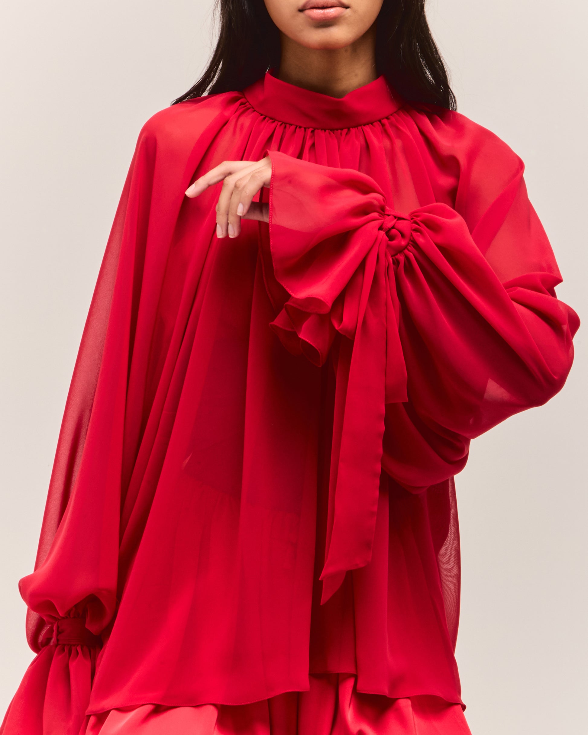 Confeccionada em musseline, essa blusa vem em um tom vibrante de vermelho que destaca qualquer look. Com modelagem oversized, caimento fluido e comprimento regular, a peça traz punhos com passantes e babados delicados nas mangas, conferindo um toque de feminilidade.