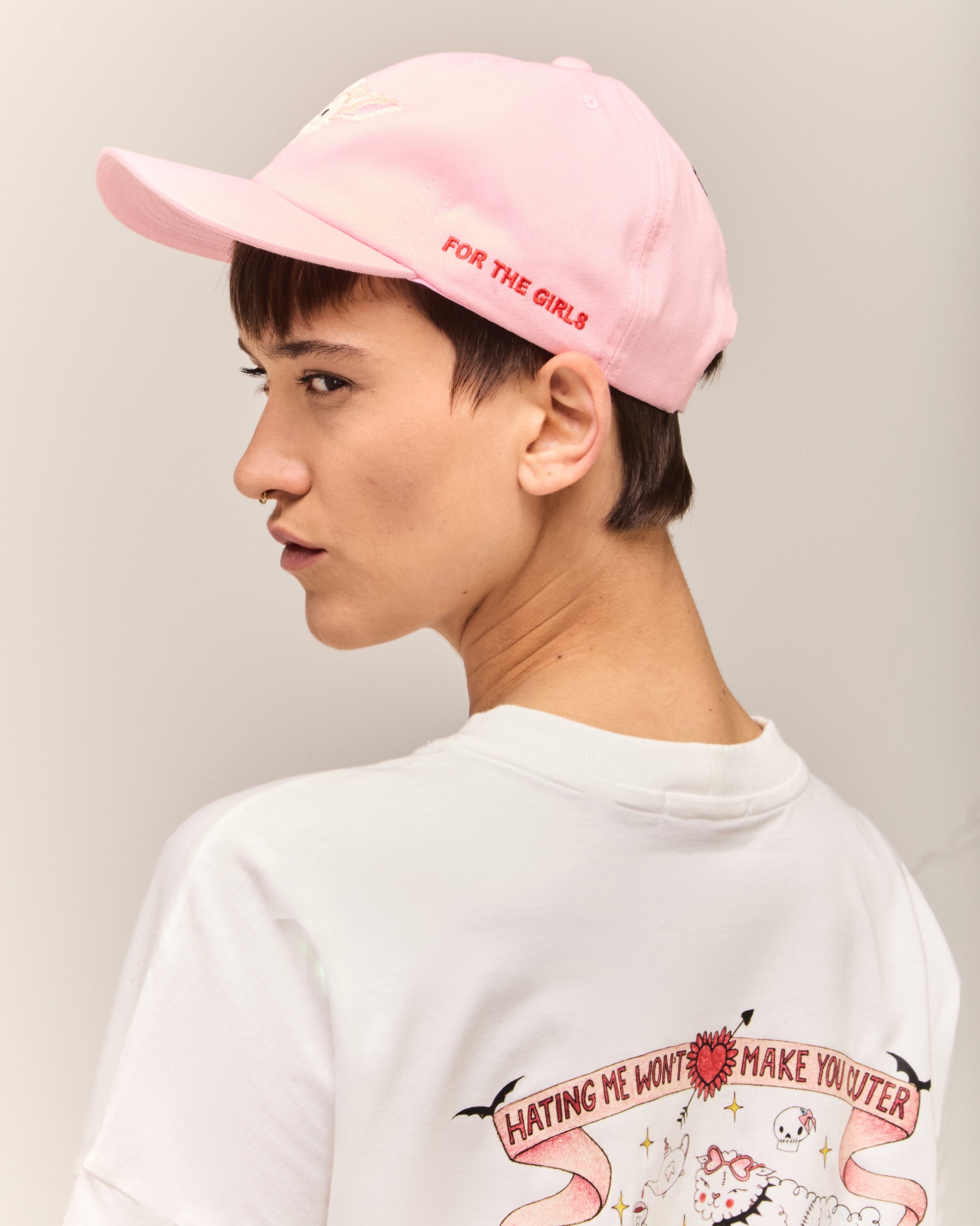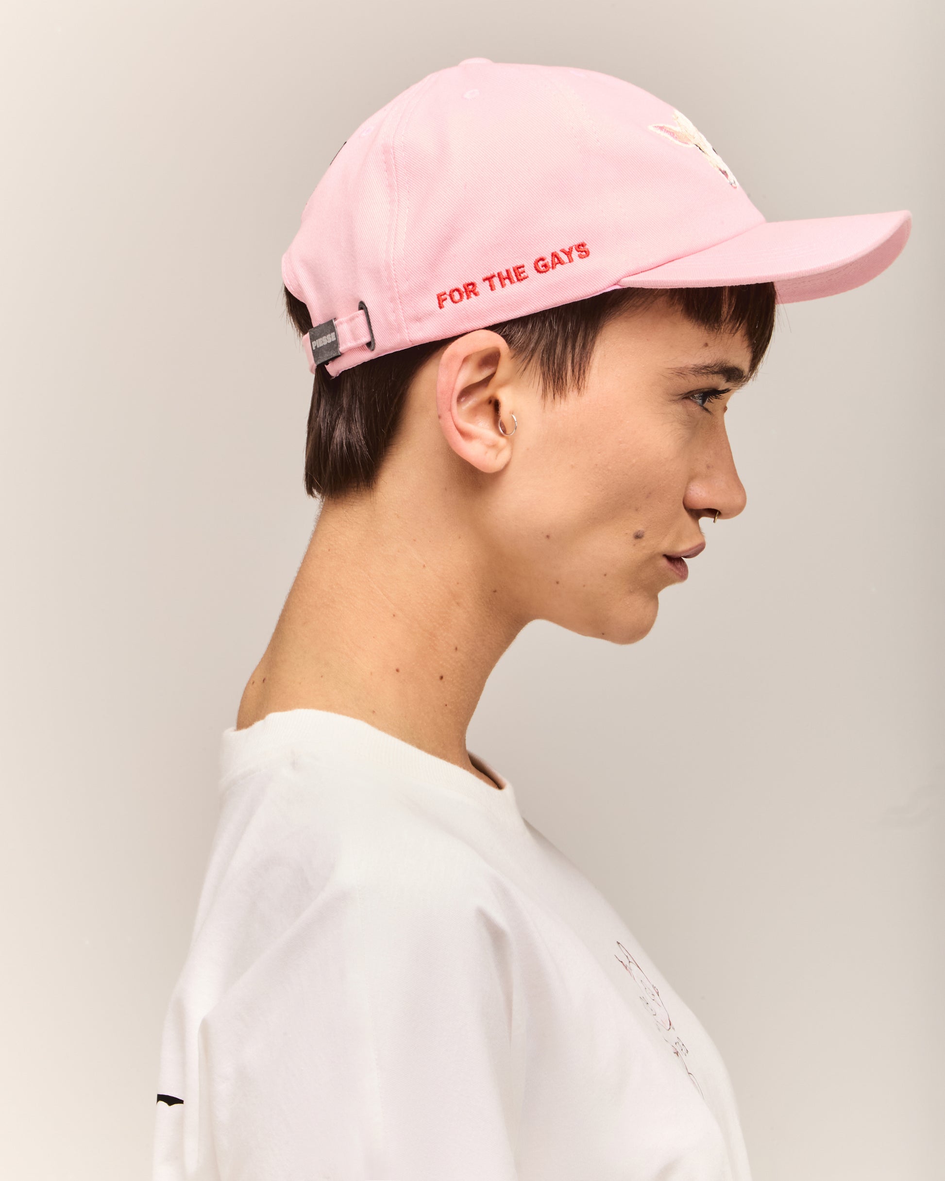 Boné tipo strapback no tom de rosa bebê, reforçando o DNA Piesse. Possui aba curva e pespontada com ovelha bordada na parte frontal, possui um fecho com fivela, personalizada PIESSE, e tira de tecido na parte traseira, oferecendo um ajuste mais elegante. Laço bordado na parte posterior e, nossa icônica frase, "For the gays, for the girls" também bordada nas laterais.