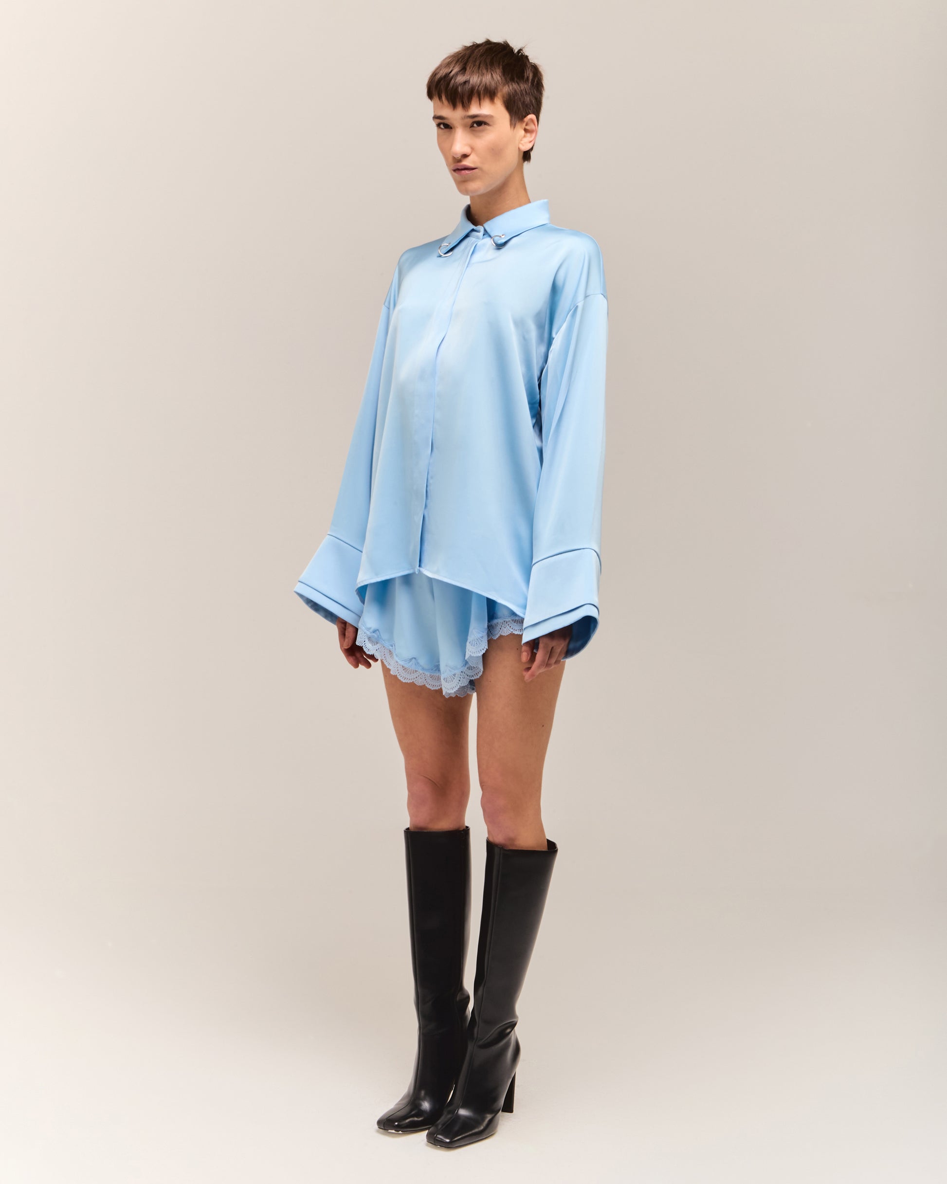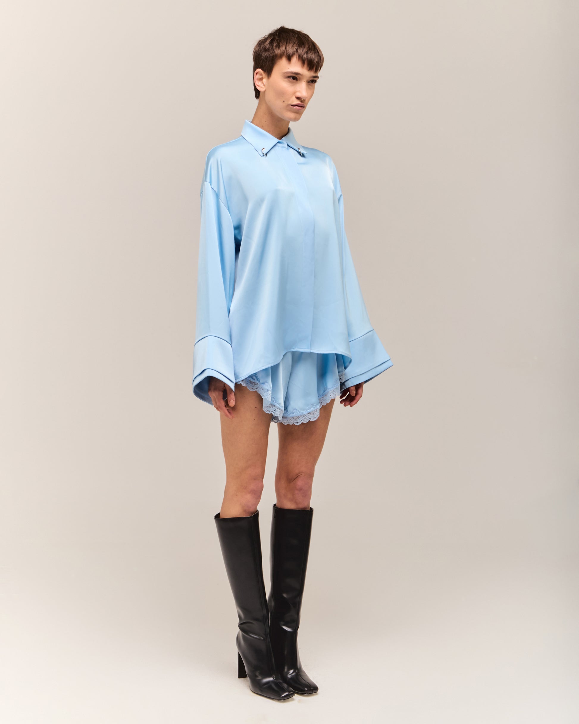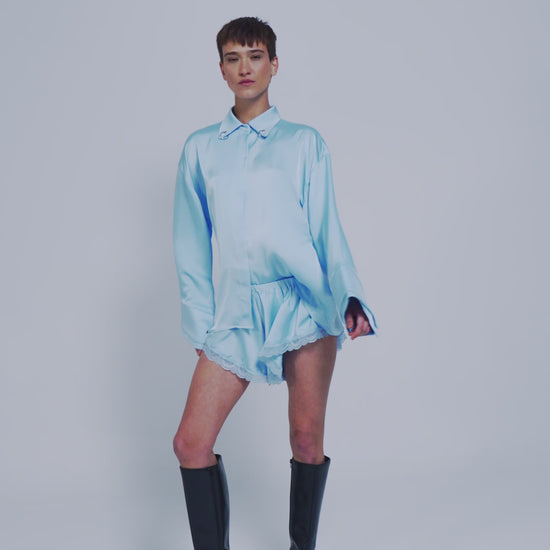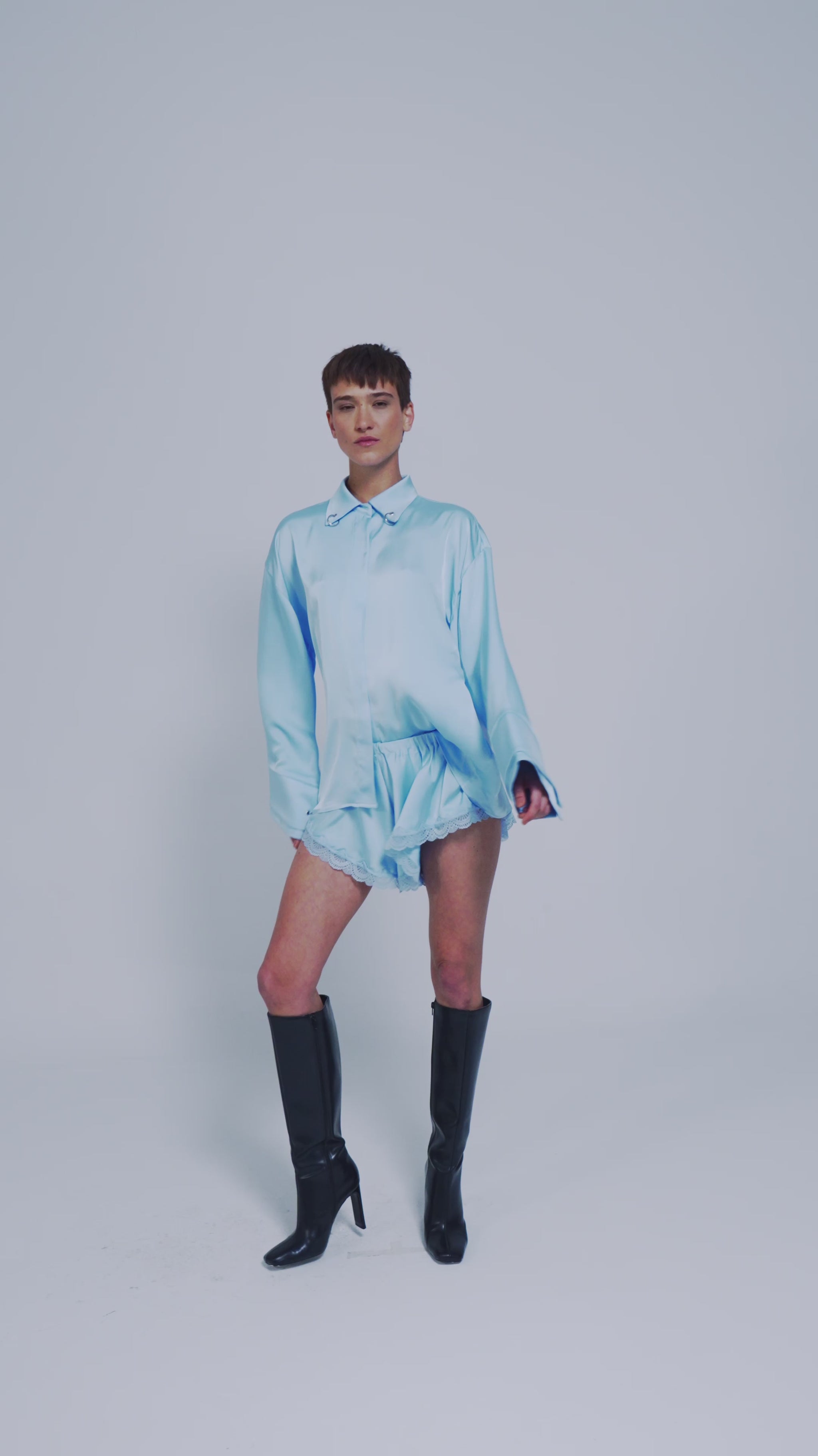 Nossa Camisa Frost possuí um caimento amplo, modelagem oversized, possui os ombros deslocados, e com punho duplo. Possui um toque de rebeldia com ilhós e piercing na gola e nas mangas. Todo o abotoamento frontal é feito com botões de pressão. O tecido possui um toque sedoso e um leve brilho acetinado.