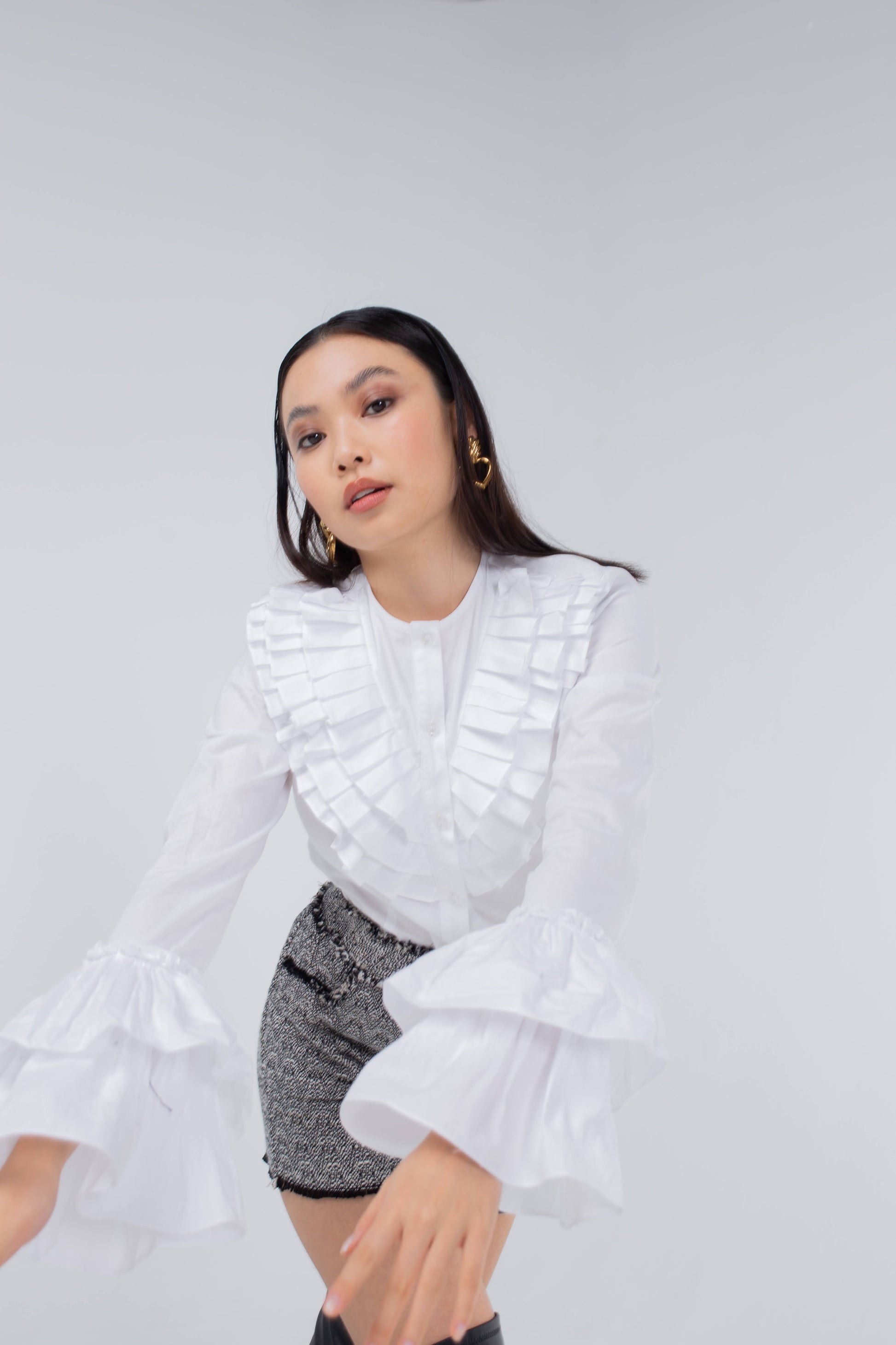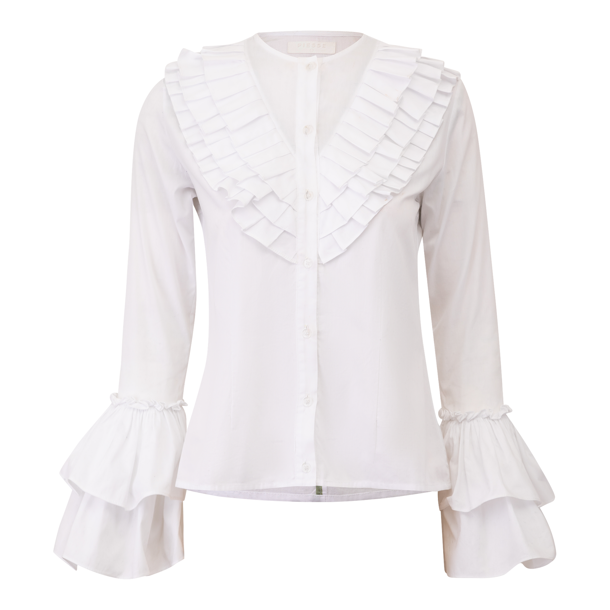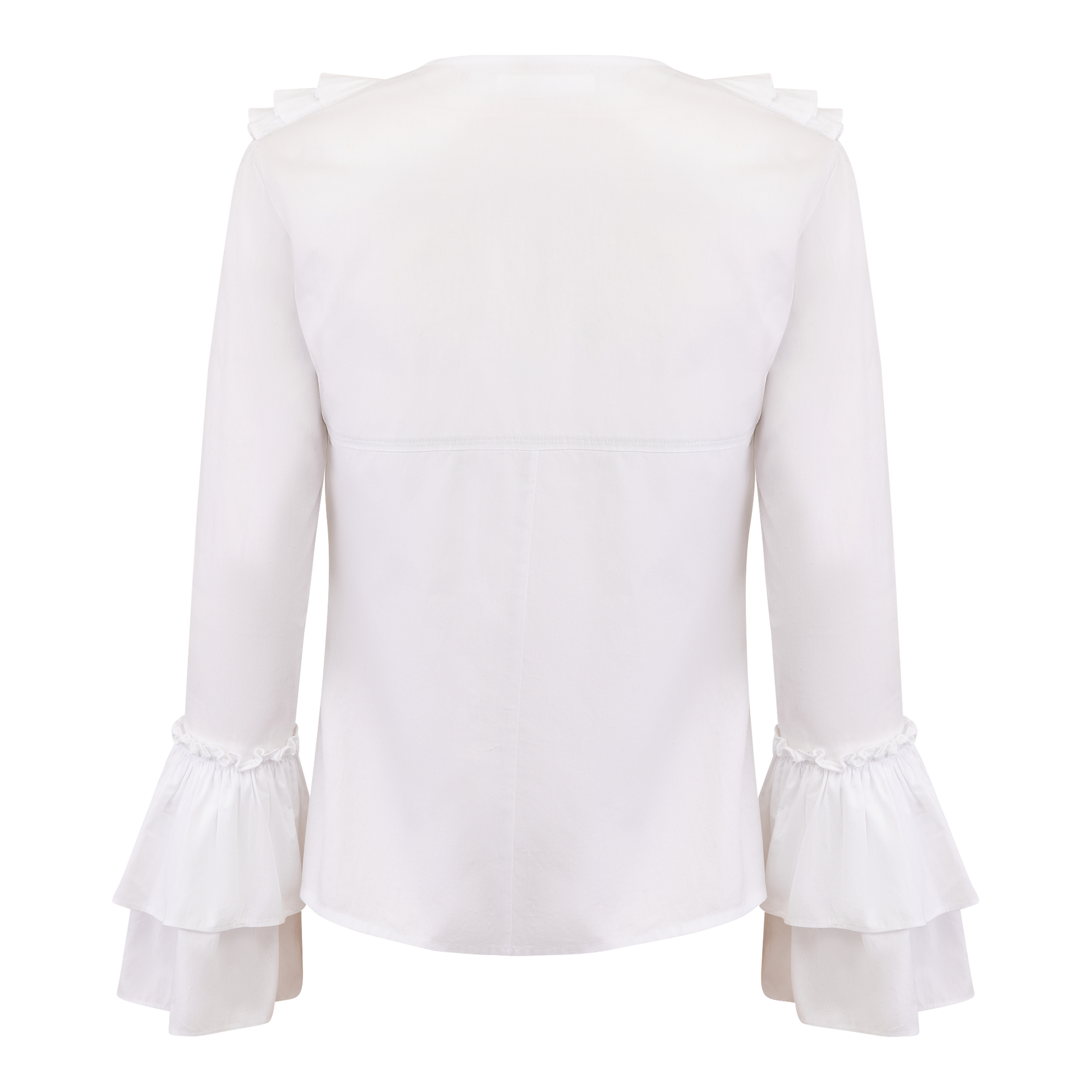 Camisa confeccionada em tricoline de algodão, peça de modelagem regular com caimento reto. Fechamento por botões com vista sobreposta, detalhes por conta de babados do próprio tecido aplicado em gola careca e mangas longas.
