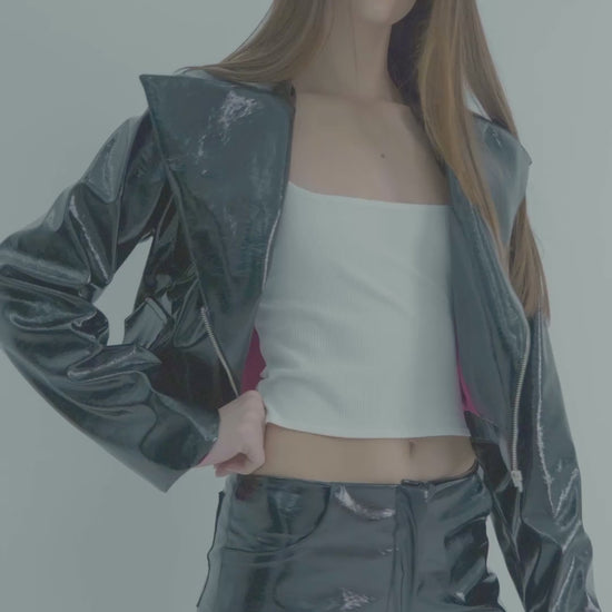 Jaqueta em vinil preto com modelagem oversized, forrada inteiramente em cetim pink para mais conforto e estilo. Inspirada nos shapes clássicos dos anos 70, é perfeita para looks cheios de personalidade.