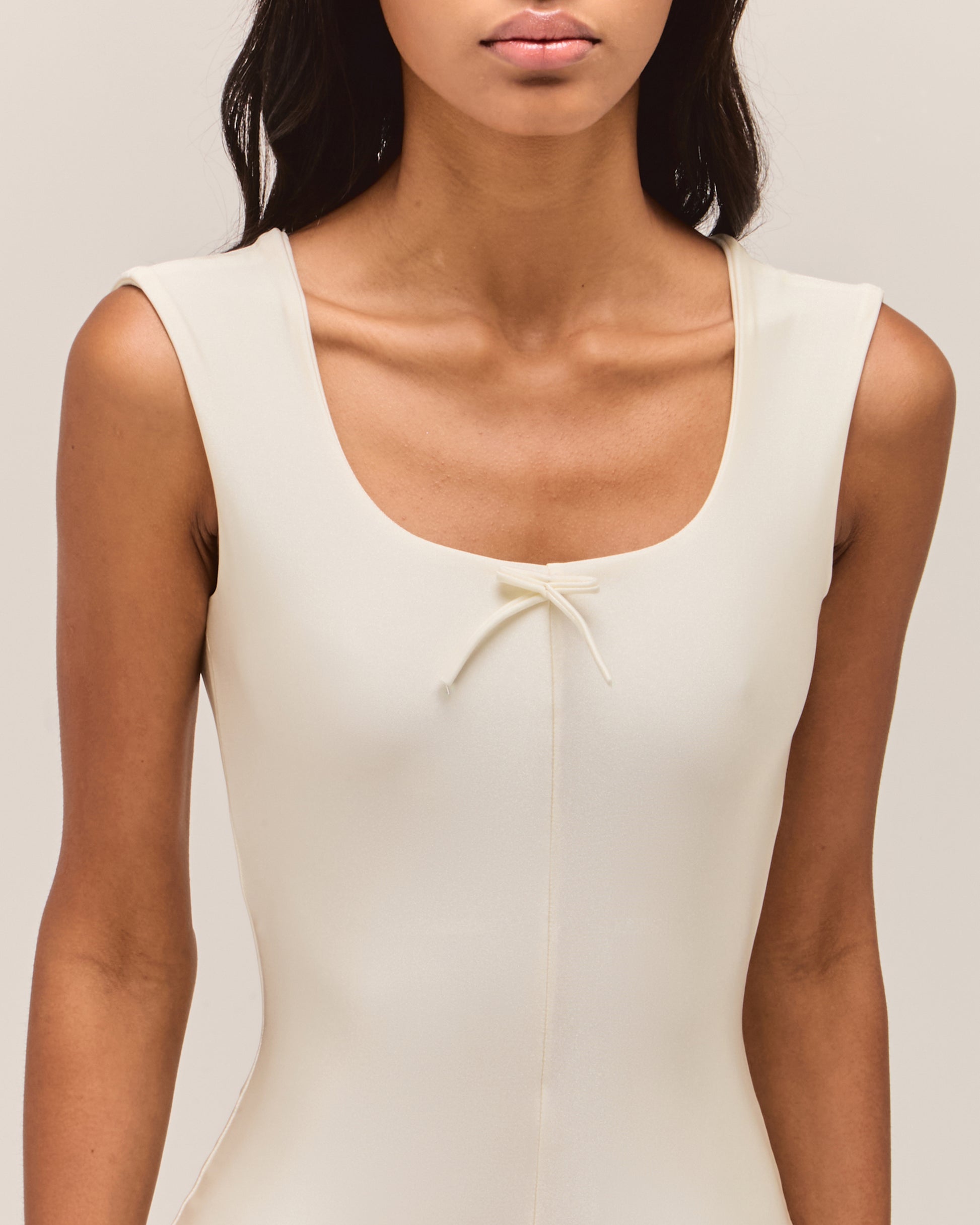 Macaquinho confeccionado em trilobal beach, tecido que traz um brilho acetinado e metalizado com um toque macio. A peça é contruida com mddelagem ajustada ao corpo, porém o elástano presente na composição facilita na vestibilidade e no conforto. Um dos pontos altos da peça são as costas nuas e o decote quadrado com alças retas, que valorizam o busto.